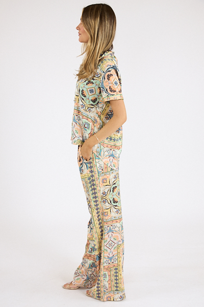 The Gemma Button Down is a silky blouse with a short cuffed sleeve and collar details.