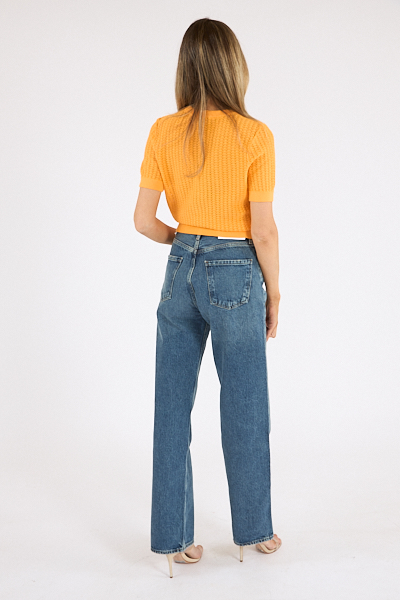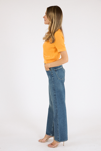 The Mozart short sleeve top features an open-stitch design with pearly accents at the front for a glossy highlight.