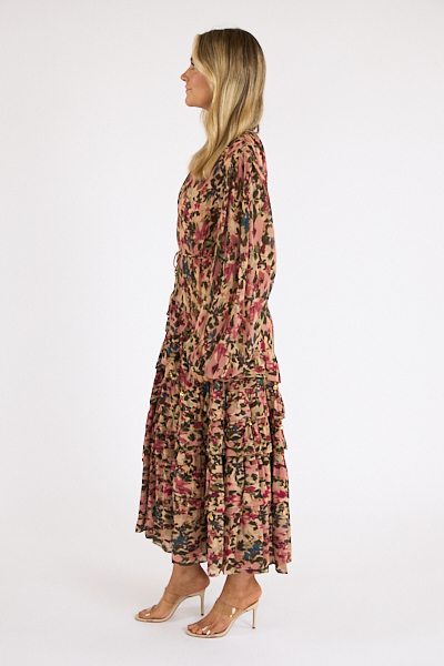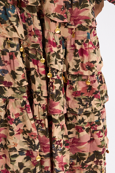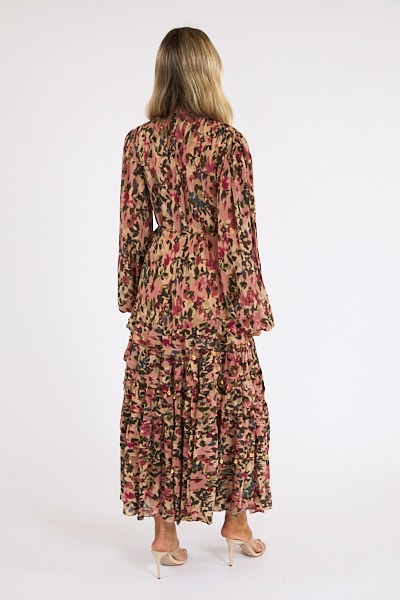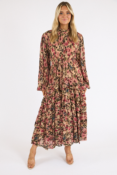 The Pink Blurred Tiny Flowers Maxi Dress is designed with layered ruffles, delicate bead accents and long, billowy sleeves.