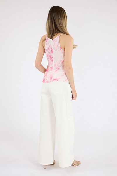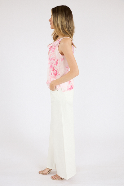 A drapey cowl neckline tops this sleek sleeveless top covered in a dreamy floral print.