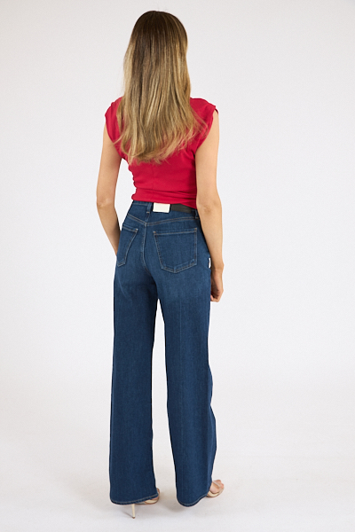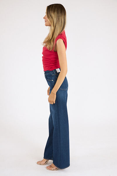 Amara has a power shoulder, mock neck, and side ruching with a cropped silhouette that hits at the waist of high rise bottoms.