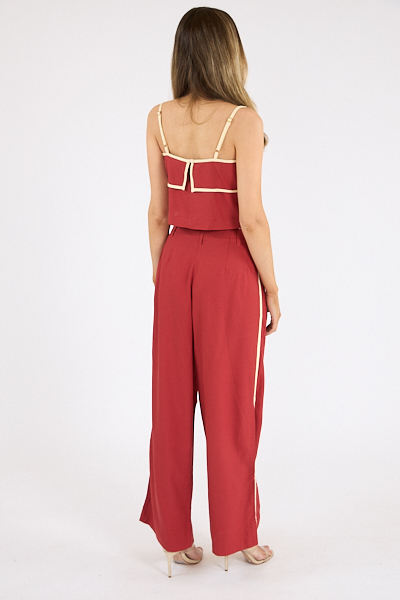 A pleated waist trouser with an intricate rope wait belt and contrast piping down the sides.