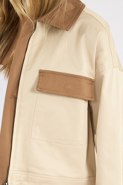 The Monica Jacket is crafted from beige and khaki cotton with a hint of stretch, featuring a boxy, oversized fit. Designed with a colorblocked collar and pockets, it pairs perfectly with the Monica Skirt for a complete set.