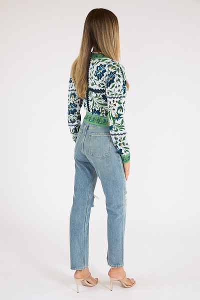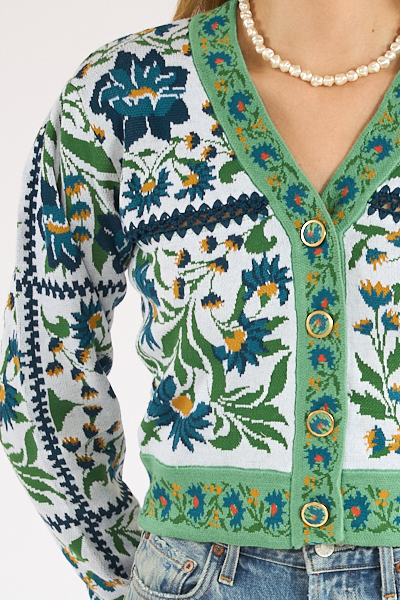 This floral cardigan features a contrasting border with delicate blooms and a crocheted inset for a subtle peekaboo detail. Finished with fabric-covered, flower-print buttons for a feminine touch.